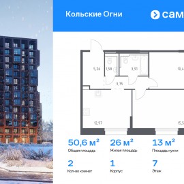 Строим кварталы для жизни с заботой о будущем. Предлагается 2-комнатная квартира комфорт-класса 50, 61 кв.м в корпусе 1 на 7 этаже, в ЖК «Кольские Огни» Квартира без отделки. Доступность опции «отделка» и возможность комплектации мебелью и декором уточняйте у...