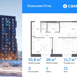 Строим кварталы для жизни с заботой о будущем. Предлагается 2-комнатная квартира комфорт-класса 51, 76 кв.м в корпусе 1 на 11 этаже, в ЖК «Кольские Огни» Квартира без отделки. Доступность опции «отделка» и возможность комплектации мебелью и декором уточняйте у...