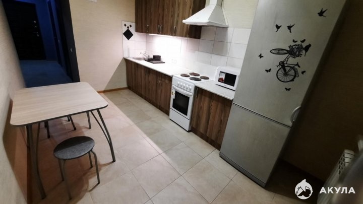 Полностью оборудованная кухня: холодильник, плита с 4 конфорками, духовка, микроволновка, электрический чайник, небольшой набор посуды.