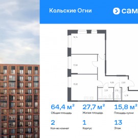 Строим кварталы для жизни с заботой о будущем. Предлагается 2-комнатная квартира комфорт-класса 64, 41 кв.м в корпусе 1 на 13 этаже, в ЖК «Кольские Огни» Квартира без отделки. Доступность опции «отделка» и возможность комплектации мебелью и декором уточняйте у...