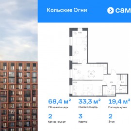 Строим кварталы для жизни с заботой о будущем. Предлагается 2-комнатная квартира комфорт-класса 68, 37 кв.м в корпусе 3 на 2 этаже, в ЖК «Кольские Огни» Квартира без отделки. Доступность опции «отделка» и возможность комплектации мебелью и декором уточняйте у...