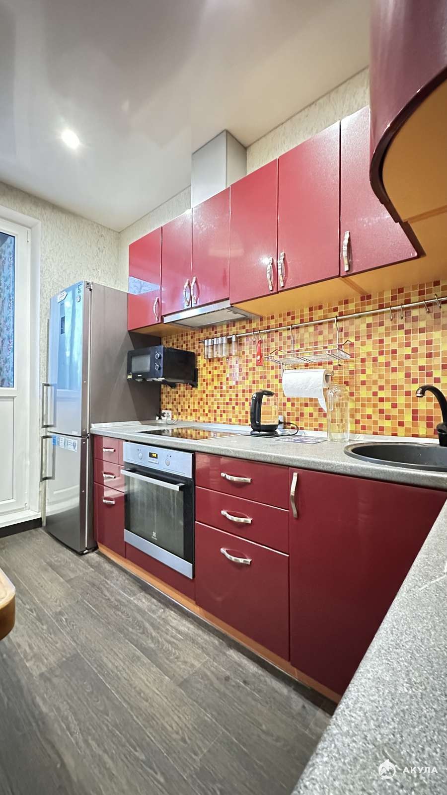 В шаговой доступности Гимназия № 9, детский сад и магазины. За домом остановка автобуса № 33 (удобный маршрут).