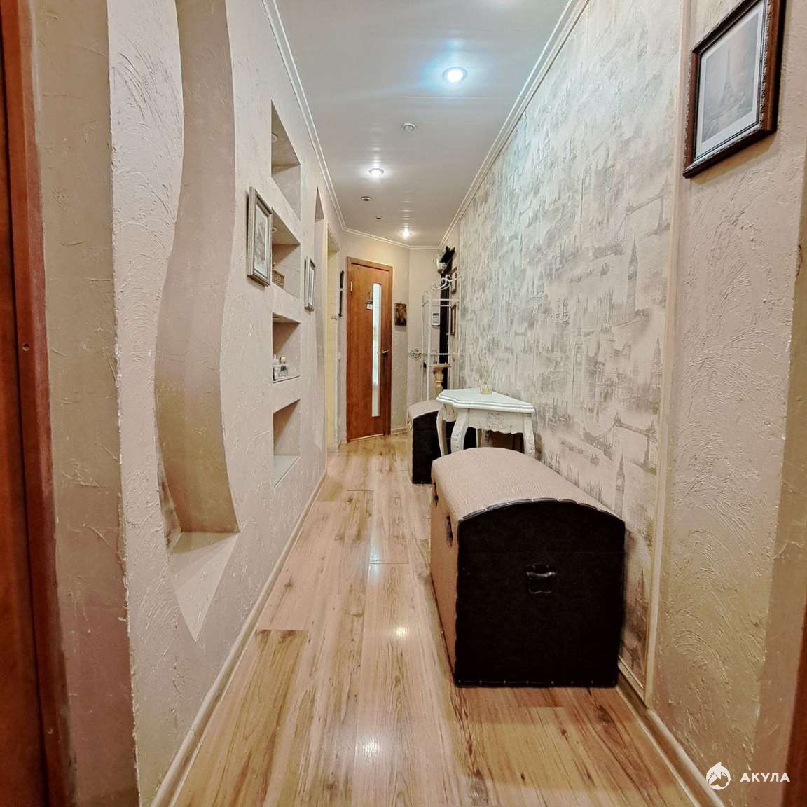 дополнительные ниши с подсветкой и капитальные полки, что позволяет расставить предметы интерьера по своему усмотрению